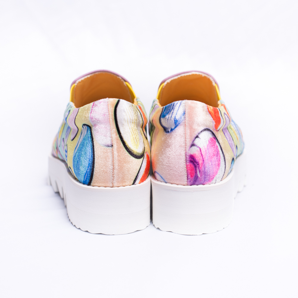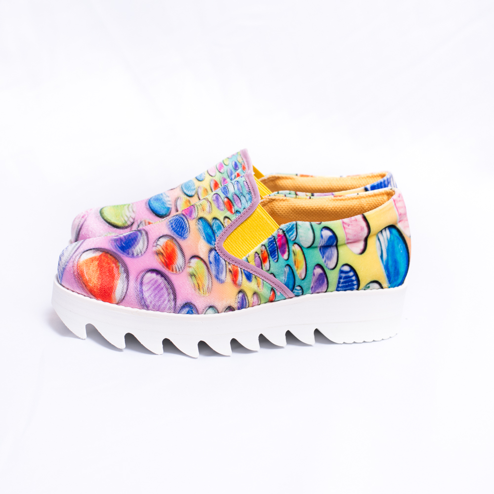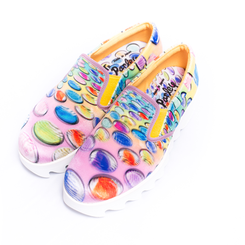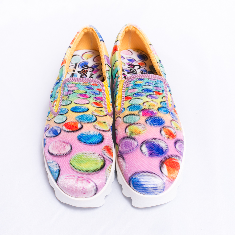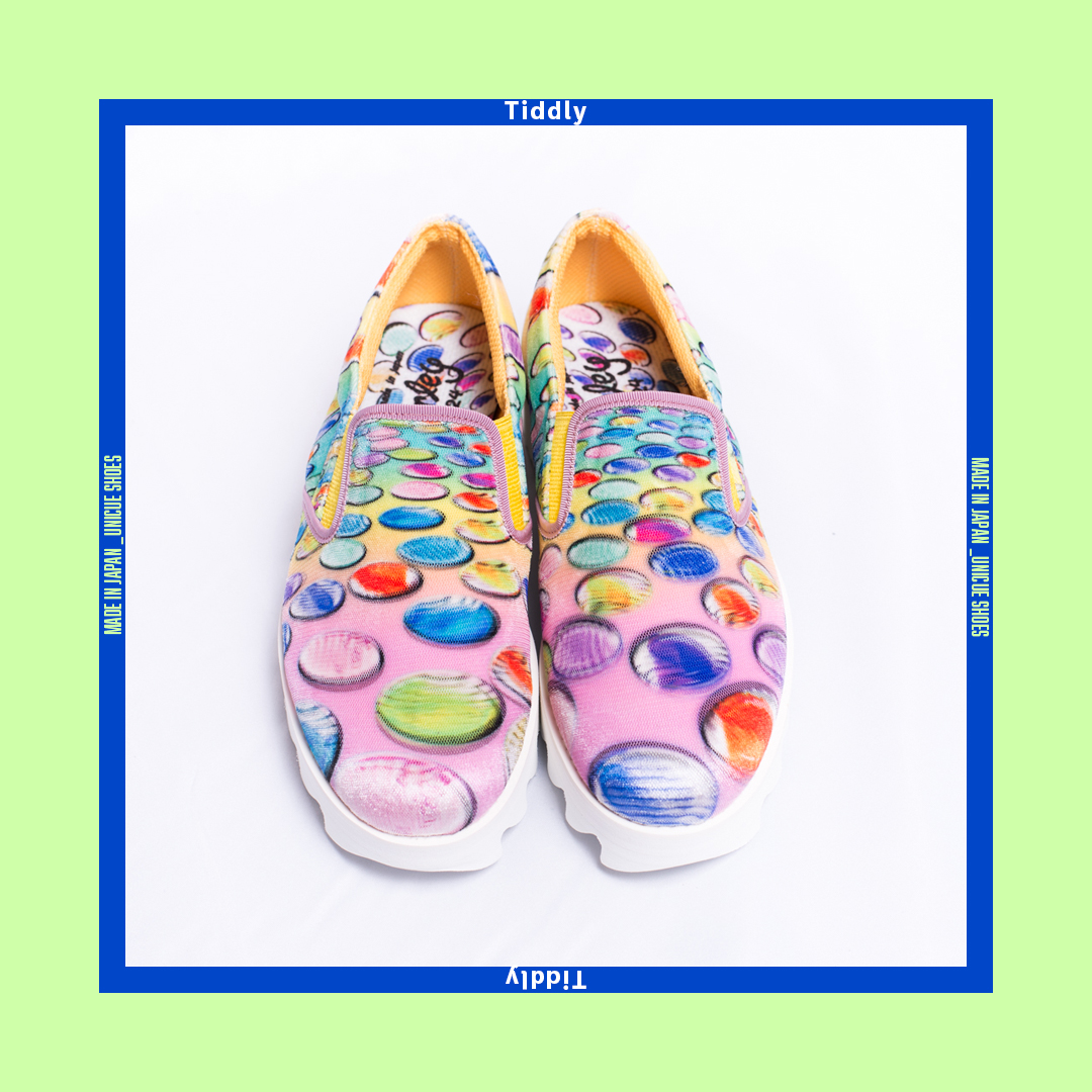 おはじき柄のカラフルなプリントが特徴のスリッポン。