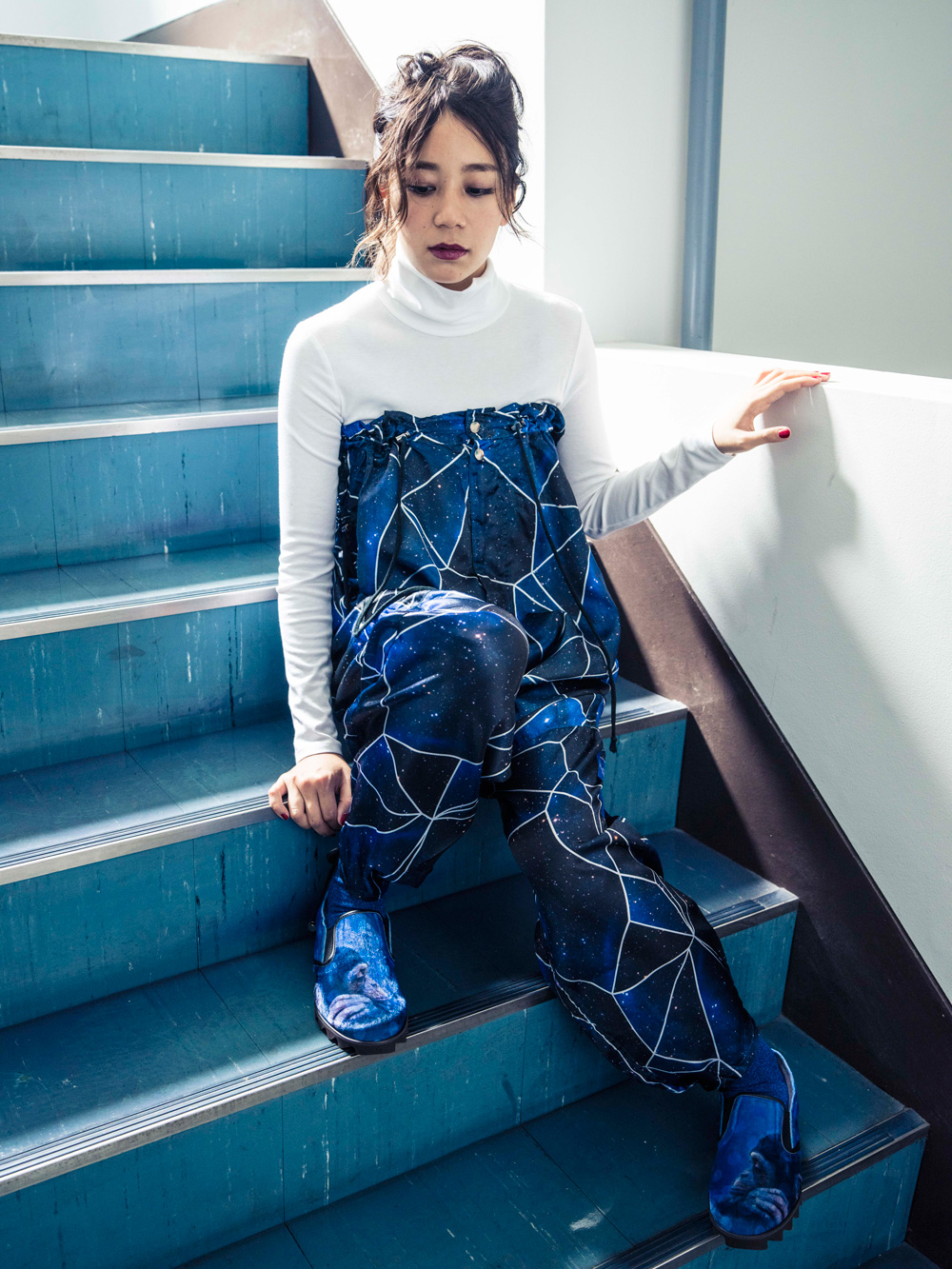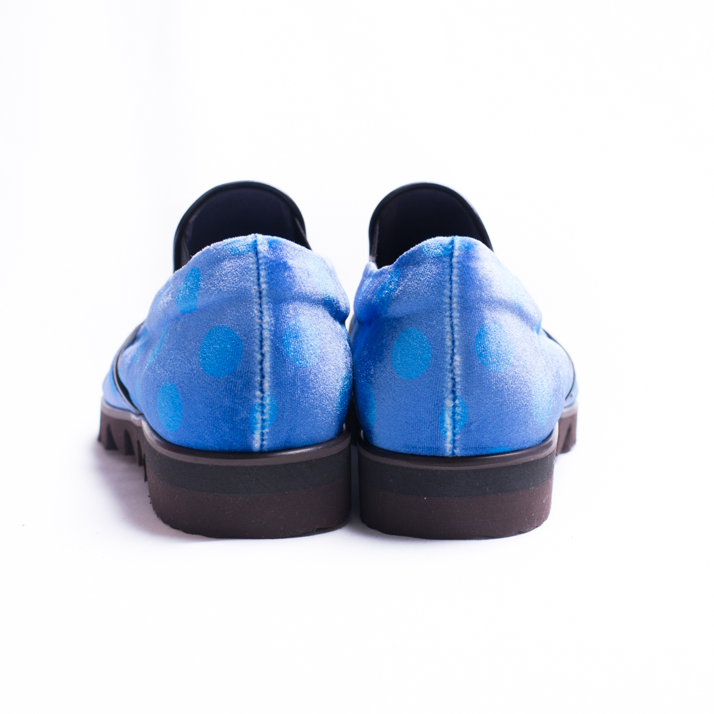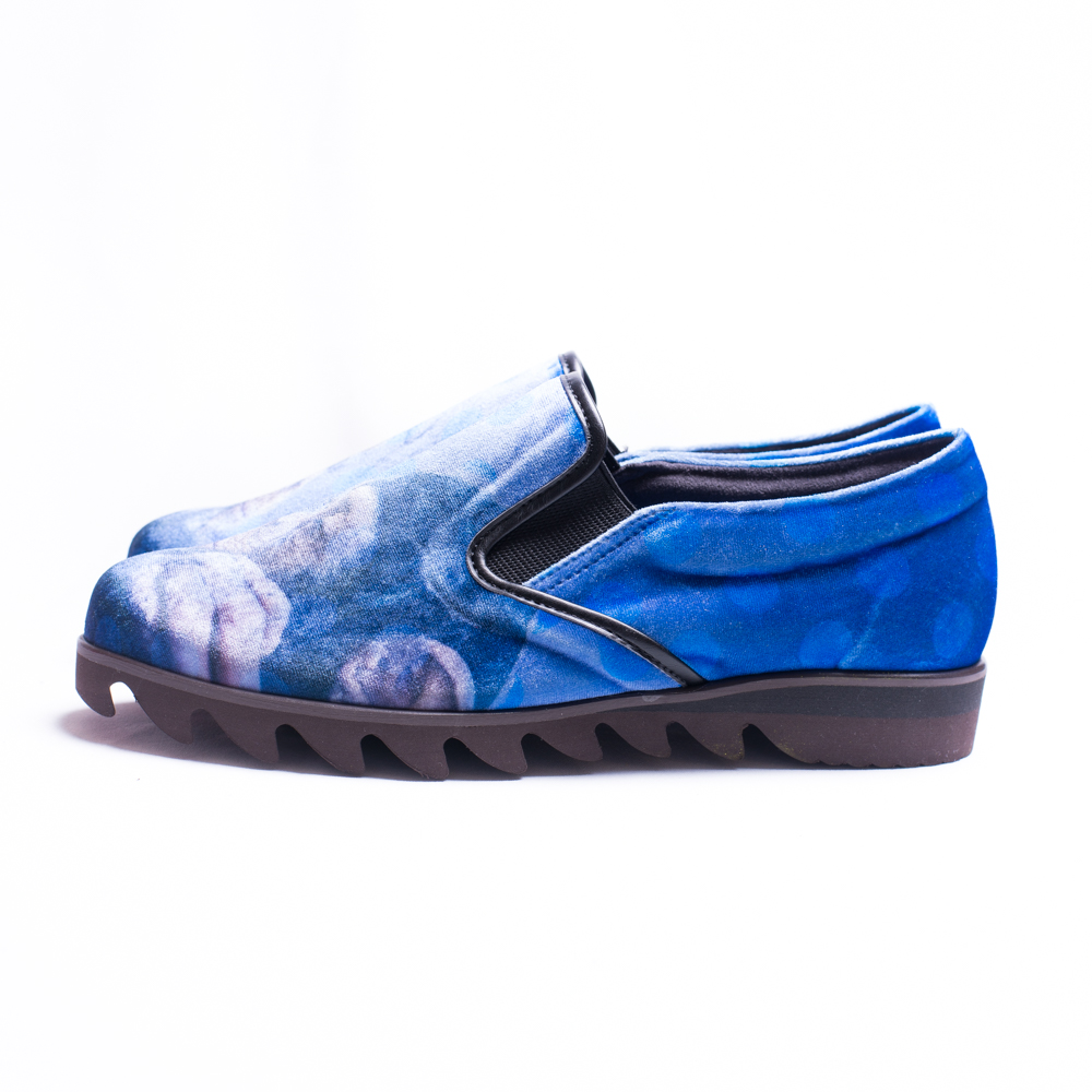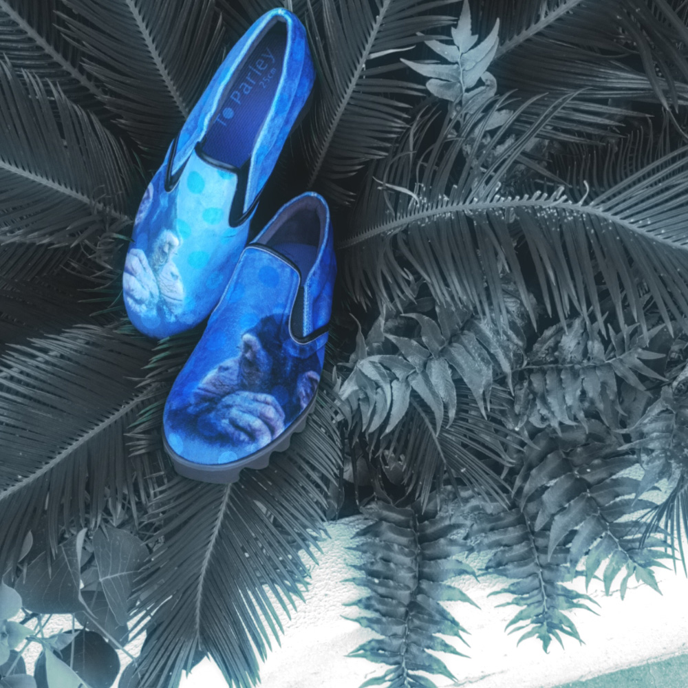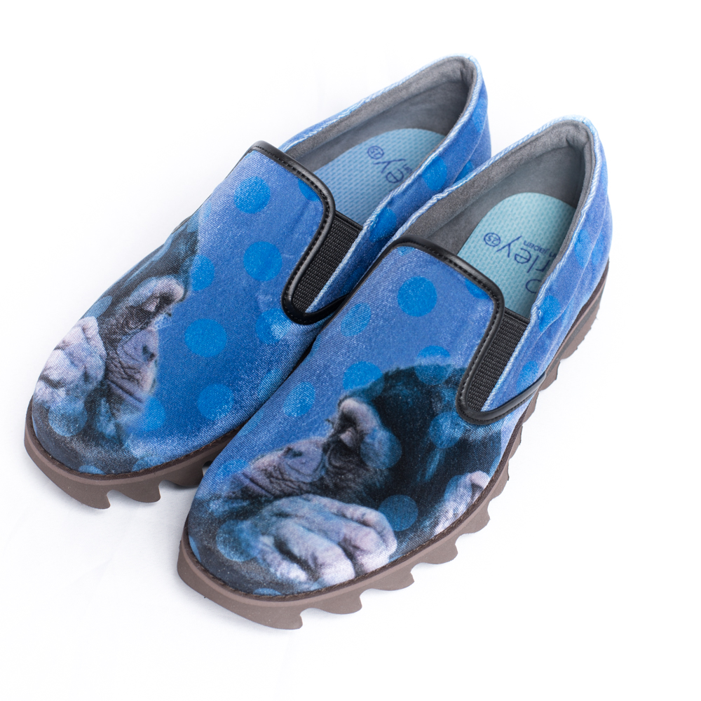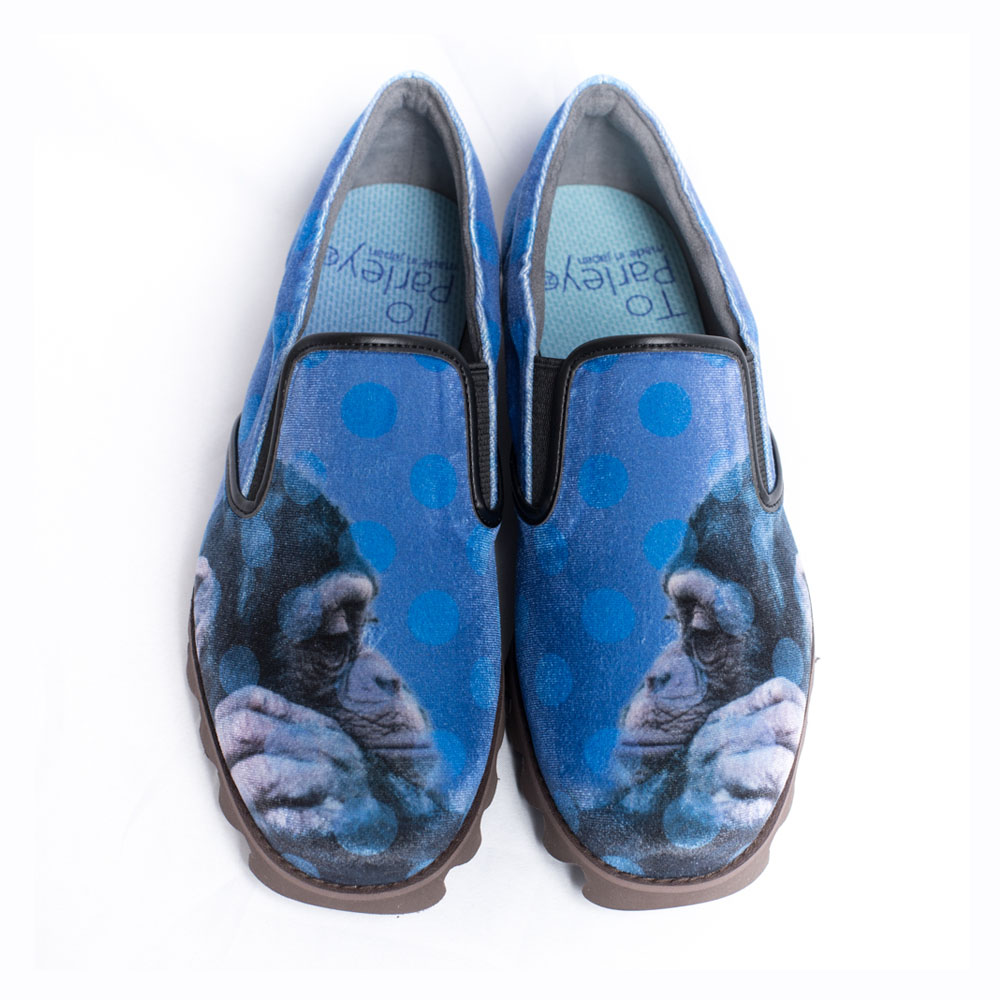 ベルベット調の生地にメランコリックなチンパンジーがプリントされた1足。