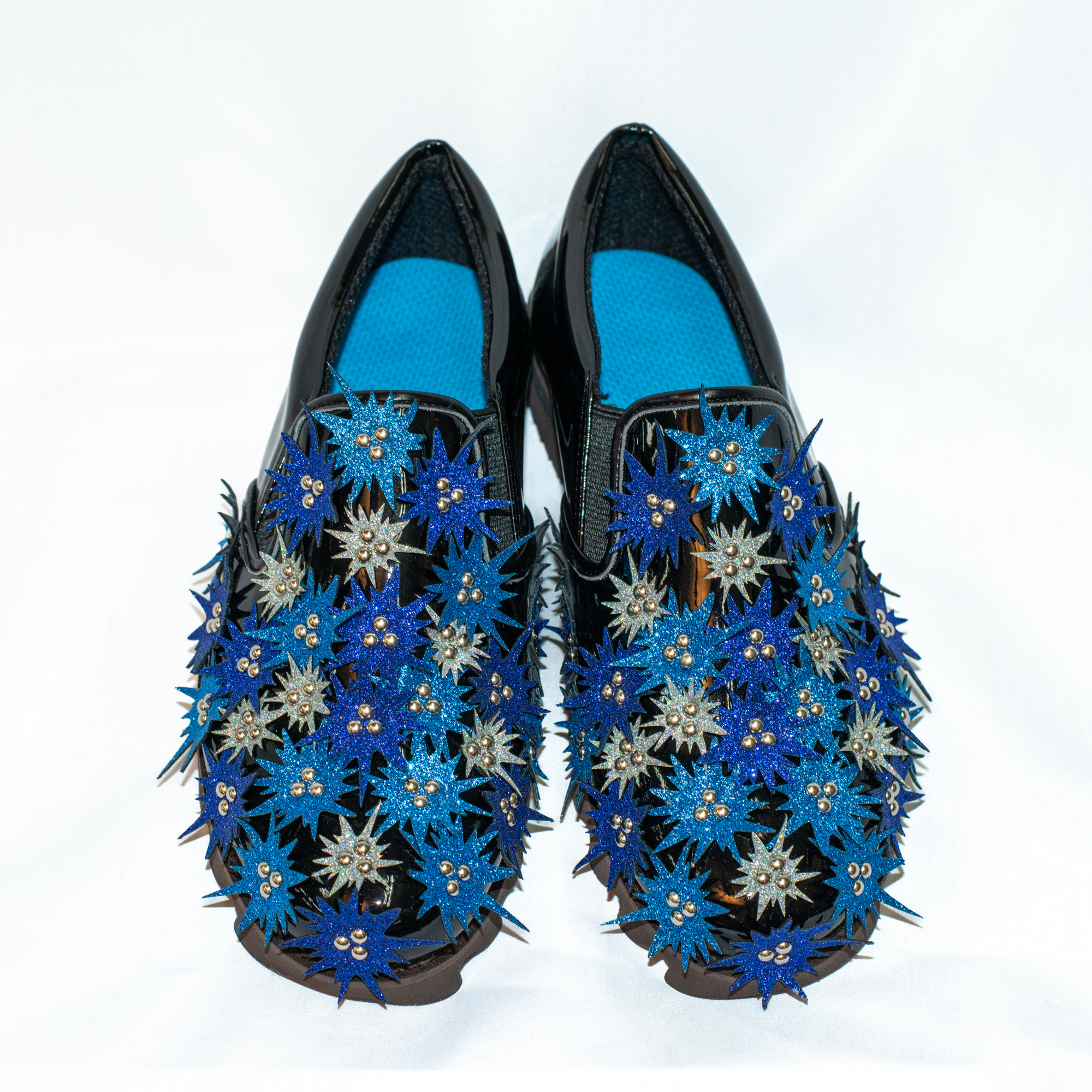 ブラックのエナメル調生地に、トゲトゲしたグリッターが眩しくひかる。