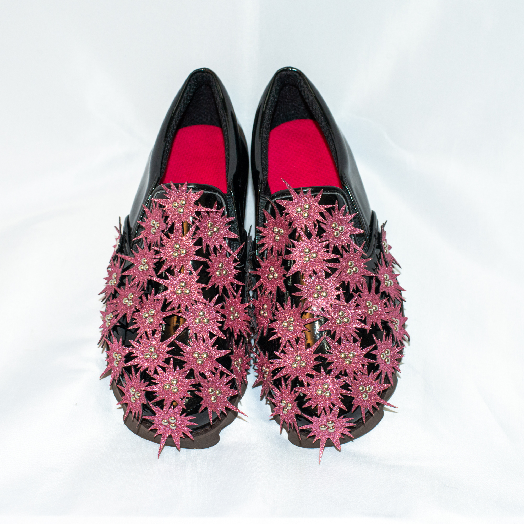 ブラックのエナメル調生地に、トゲトゲしたグリッターが眩しくひかる。