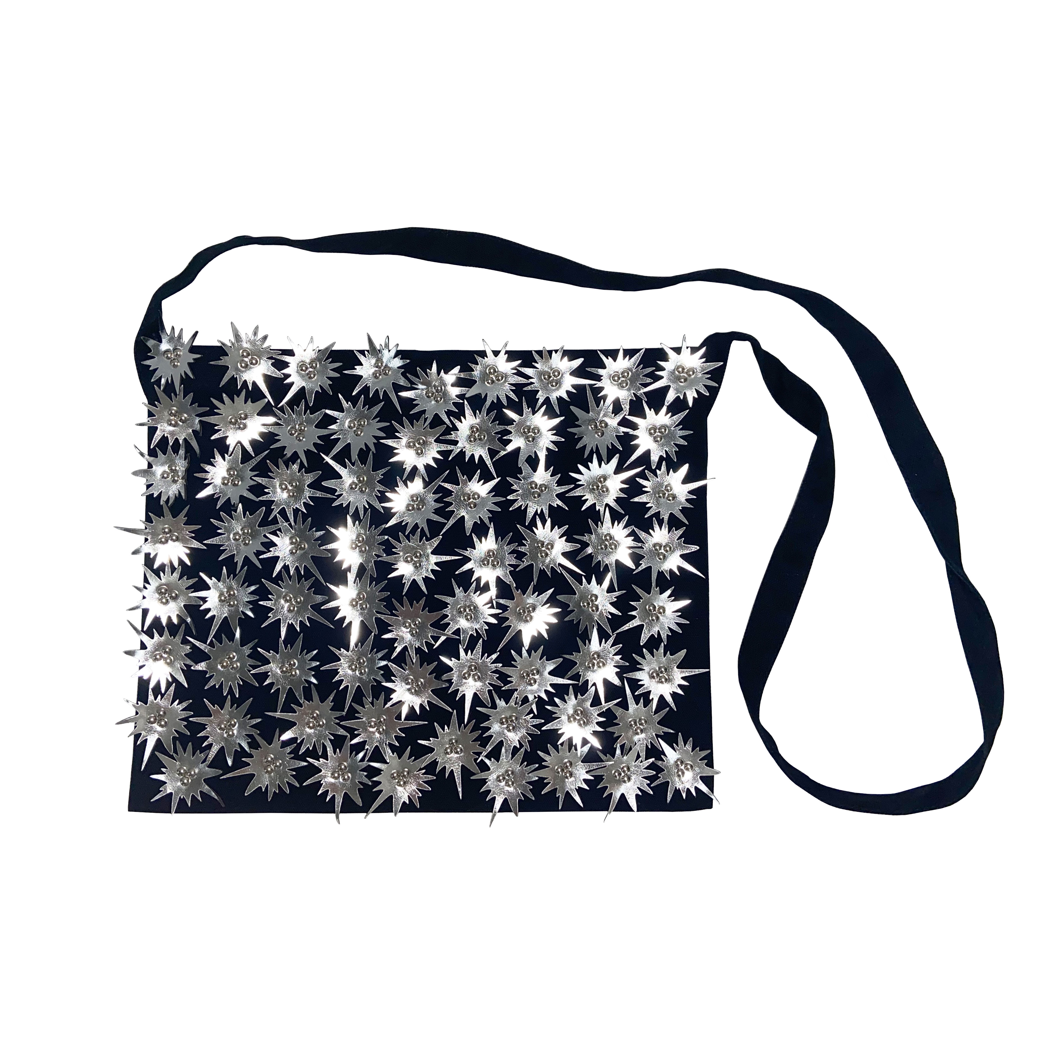 レーザーで切り抜いたトゲトゲのグリッターを約210個のリベットを手作業で一つづつ丁寧に打ち付けています。
